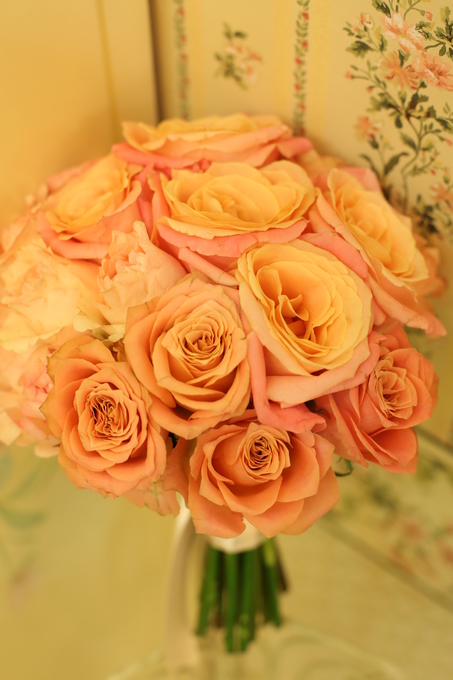 ピンクとアプリコット系のバラのみでまとめたクラッチブーケicon:emoji045