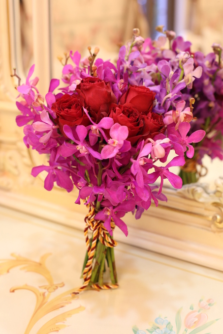 艶やかな真紅のバラと 、2色の紫色のランをミックス。
