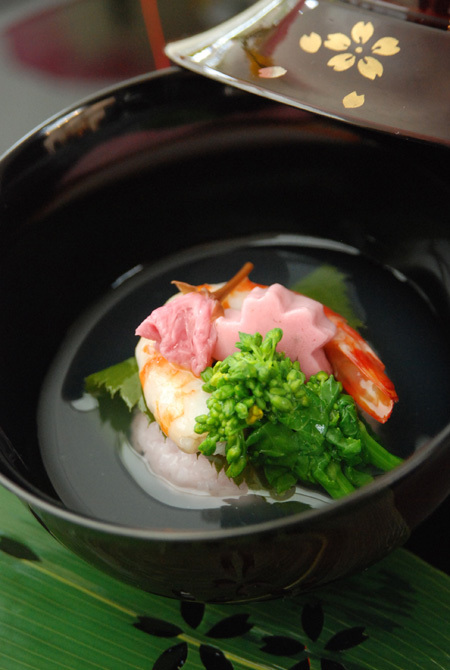 ピンク色の道明寺粉で作ったお団子に、桜の葉を巻き、車海老と桜の加賀生麩ををのせて蒸し上げたお料理です![]()