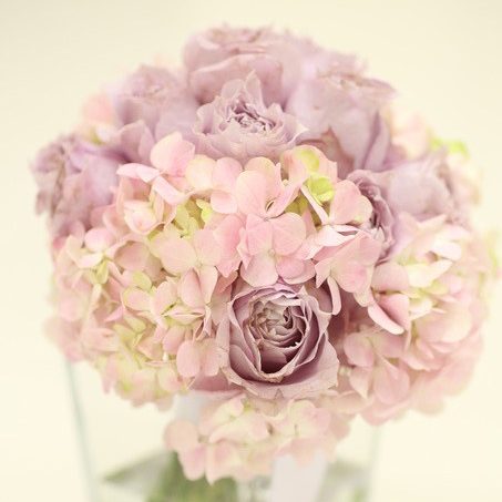 愛らしい淡いピンクのアジサイと、パープルのバラを使ったクラッチブーケ![]()