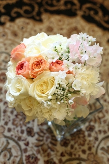 淡いピンクとホワイトのやさしい色味のお花たちが、