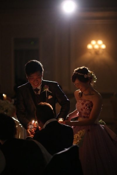 新郎新婦様とゲストの皆様でキャンドルの灯をつないでいき、灯が全員に行きわたると、