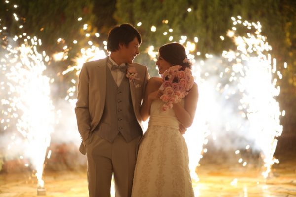 新郎新婦様の後ろにキラキラと輝く花火は、