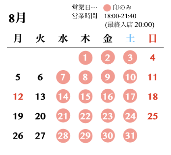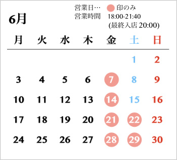 ※毎週火曜日(祝日の場合は営業)が定休日となります。ご了承ください。
