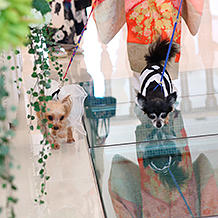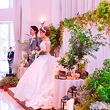 朝から青空に恵まれ、ひと際眩しく輝く純白のチャペル。透明感のある堂内に水音が響き、より清らかな雰囲気の中で誓いを交わした。「うちのヨークシャテリアとチワワもリングドッグとして活躍し、証明書のサインを友人にサプライズでお願いするなど、ステキな思い出ができました。階段でのフラワーシャワーも最高でした」。