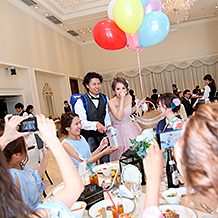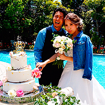パーティ会場は大好きな海にちなんだ『海カフェ+ガーデン』でコーディネート。男友達が運転するオープンカーでガーデンに登場し、プールサイドでのケーキカットに続いてお互いにファーストバイトしたり、全員でバルーンリリースをしたりと青空の下での演出を満喫。「デニムルックでカジュアルに決めたのも良かったです」。